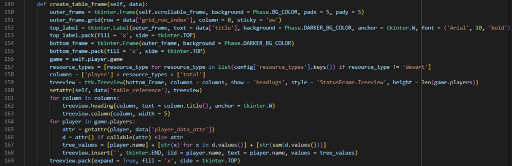 I was initially sceptical that this approach would actually work in practice, but it did. The resultant source code looks clean and easy-to-maintain; a far cry from the work I did on my Catan game, for example. You can see some example Tkinter code from that project below: