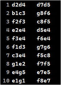 This might look like gobbledygook to somebody who’s never played chess before, but this is probably the simplest and most readable chess notation around. However, this is a notation optimised for humans rather than computers, and chess software tends to use less descriptive forms of notation internally. Coordinate notation is the notation used internally by the Python Stockfish API (which from here on out I will refer to as simply the “Stockfish API”), for example. In the below image I show the equivalent coordinate notation for the moves notated algebraically above:
