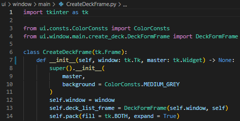 Some of my past Tkinter code has become a bit convoluted, and so for this project I wanted to take a new architectural approach. After Googling around for inspiration, I decided to devise my own solution: every single Tkinter widget in my application would be its own class, extending a built-in Tkinter widget class, and would be responsible for “packing” itself, with the packing taking place within the constructor. Sub-widgets (widgets within other widgets; all widgets except the root widget are sub-widgets) are instantiated within their parent widgets’ constructors, creating a recursive system whereby simply instantiating the root widget generates the entire widget tree, from top to bottom. See image below for an example class: