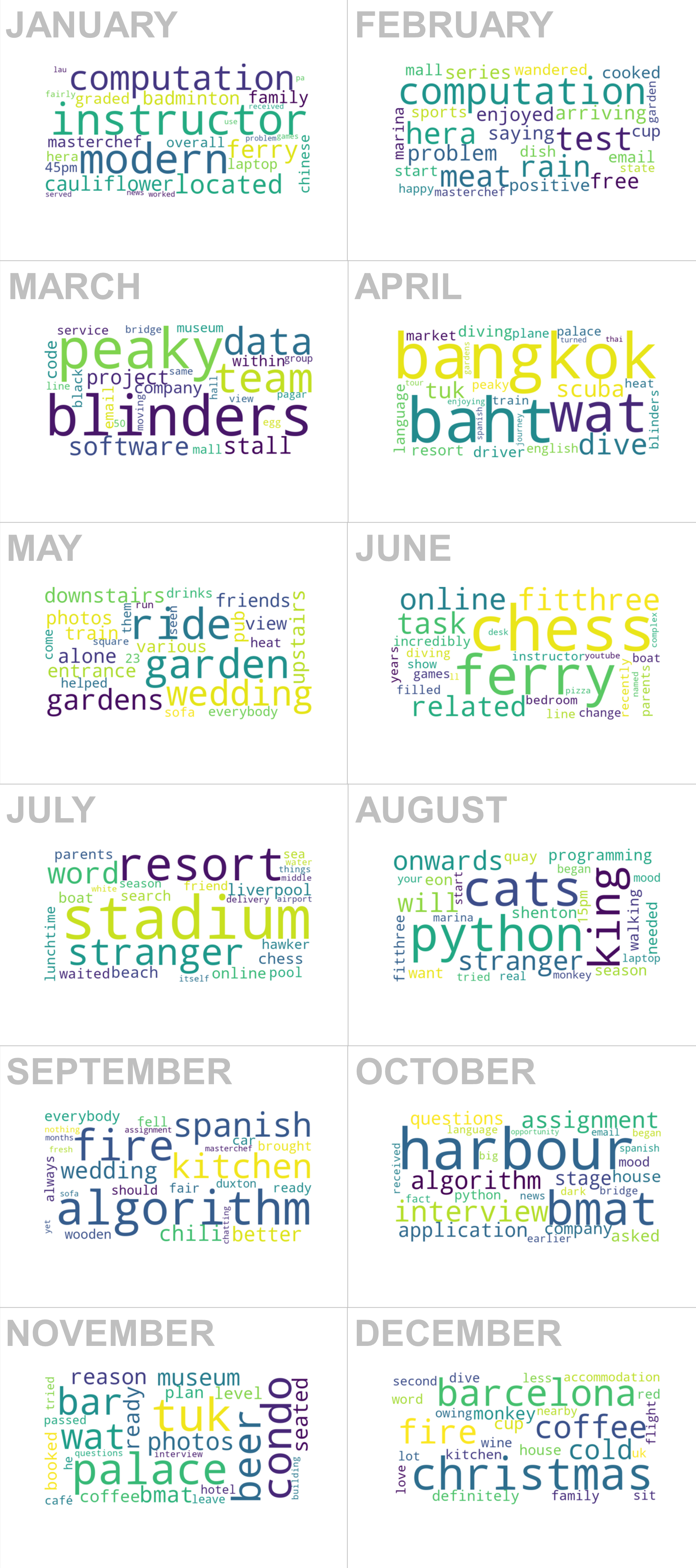 I then developed a program that allowed me to generate a word cloud for a given month, containing a given number of words, where words are sized according to their “uniqueness” to that month: