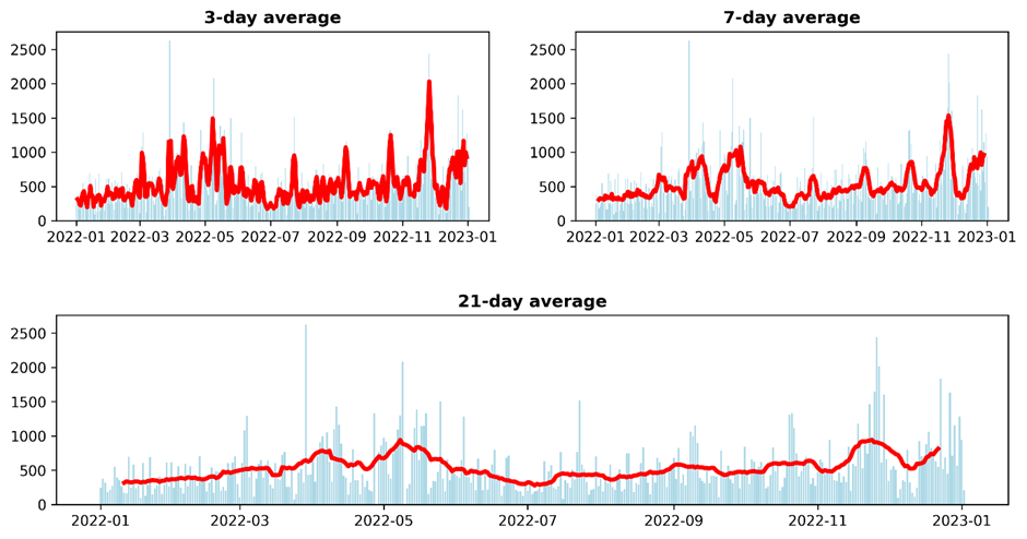 The figure above shows how the diary’s daily word count changes throughout the year. The light blue bars represent individual word counts and the thick red lines represent rolling, centred averages.