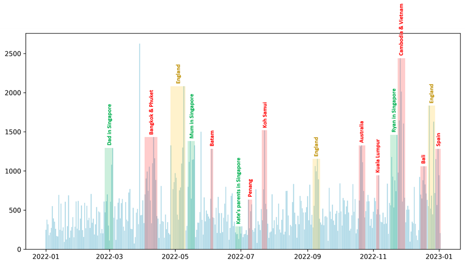 38 of the top 40 highest daily word counts came on days when I was either on holiday, in England or welcoming guests to Singapore, with the only two exceptions being the 29th March (my final day working for Twinkl, which prompted a monologue about my time at the company), and the 25th May (my first day working out of the S&P Global Singapore office). Further, 45.3% of the total words in the diary were written for days on which I was on holiday, in England or welcoming guests to Singapore, despite these days representing only 28.8% of the total number of days in the year.