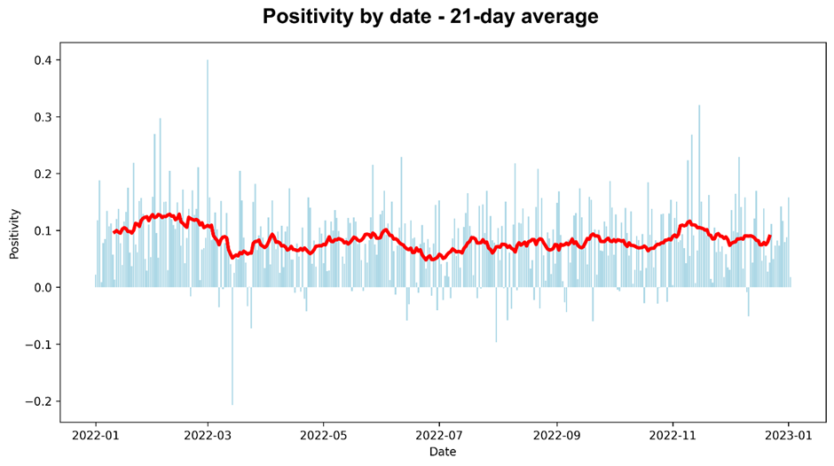 The figure above shows how the positivity of my diary entries, as calculated using the TextBlob class’s sentiment.polarity property, changes over the course of the year. Before we continue, it is important to remember that this is an extremely imperfect way of capturing positivity.