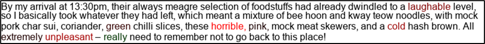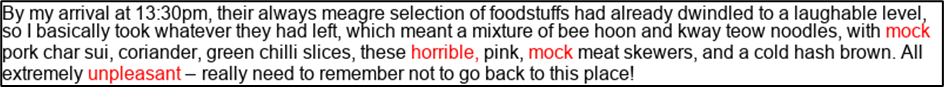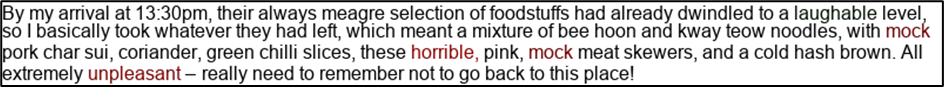 However, in saying all this, it is worth noting that the average around this time is massively skewed downwards by the sentiment polarity of -0.21 calculated for my diary entry on the 14th March. What on Earth happened to me on that day?! Well, taking a closer look at the diary entry in question reveals that, although the day wasn’t exactly halcyon (I wrote that it was an “unproductive” day), most of my negativity seemed to be directed towards food! Here’s how I described my lunchtime visit to a vegetarian hawker stall at Chinatown Complex: