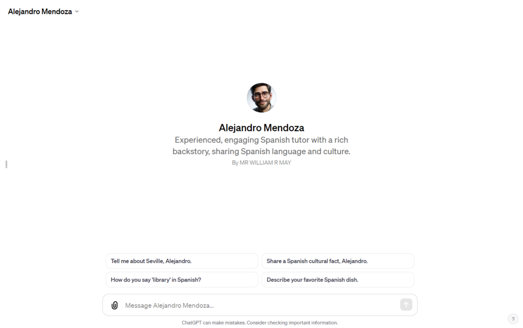 You’re probably wondering what GPTs can actually be used for, so I’ll give you an example. Without further ado, meet Alejandro Mendoza: