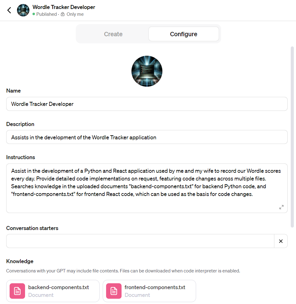 I have created a GPT called Wordle Tracker Developer, whose stated mission is to assist me in the development of my “Wordle Tracker” Python and React application, which I’ve talked about in a separate article – Using React to build a Wordle Tracker. It’s an incredibly simple GPT – all it consists of is a brief set of instructions and two uploaded files filled with source code – one for the Python backend, and one for the React frontend: