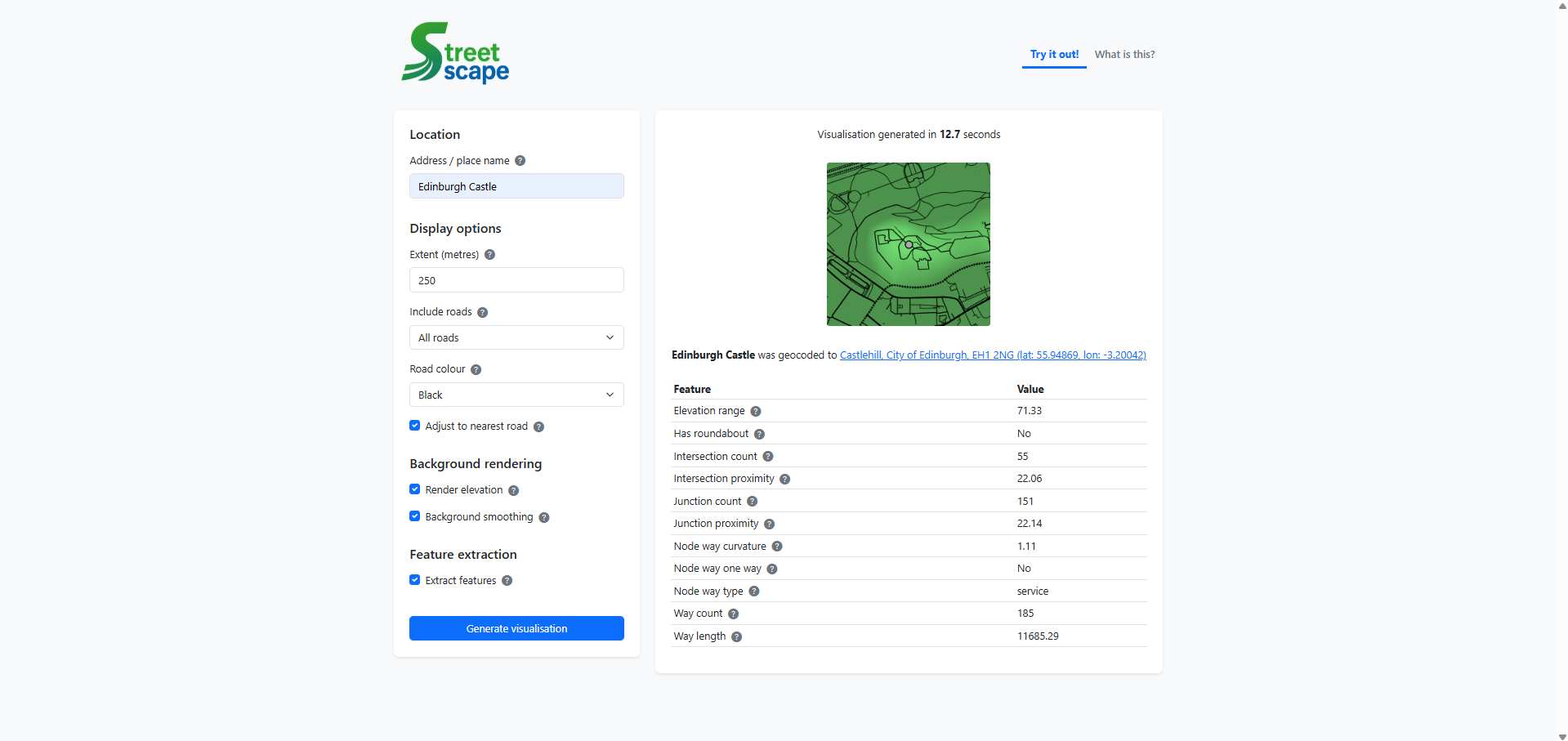 If you’re looking for a good time, get yourself down to the local boozer, pay the barman £10 to sing “WE LIKE TO DRINK WITH {INSERT YOUR NAME HERE}” while you sink a pint of best bitter in record time, and then immediately return home as if nothing happened. But if you’re looking for a good time while using Streetscape, then try to think of a query that will generate an interesting visualisation. This might mean a place where the surrounding road network has an interesting shape, or with substantial elevation change. A query like “Edinburgh Castle” with elevation rendering enabled gives a relatively interesting result (hence why I used it for the screenshot above). Complex road networks by large bodies of water can also give interesting results if you zoom out far enough (try “Lake Windermere, Cumbria” with the extent value set to at least 500 m). “The White Cliffs of Dover” is an example of a place that combines the two.