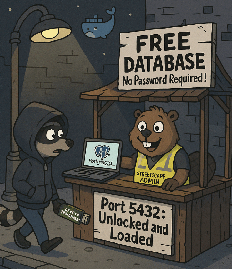 After half-an-hour or so of frantic back-and-forth with Gemini, the problem became clear: my newly-deployed Streetscape app (read all about that here) was backed by a PostgreSQL database containing OpenStreetMap (OSM) data, and that database was (A) accessible over the public internet due to the internal Docker container port being mapped to the host machine, and (B) “secured” with the default password “postgres”. This meant that an attacker scanning the internet for common database ports found my Droplet, was able to successfully log in using common default credentials, and once inside the database was able to download and execute crypto mining malware. Here’s an AI-generated cartoon to help you visualise my stupidity: