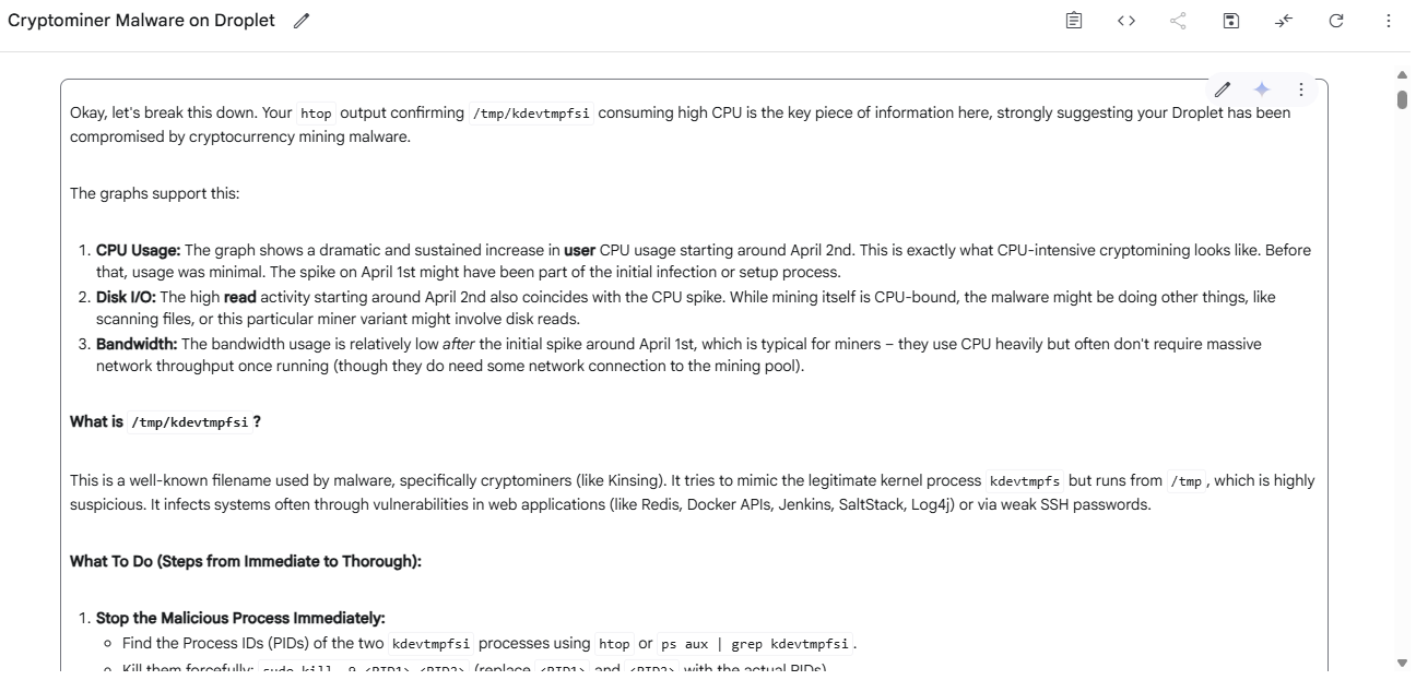At this point, as I so often do these days, I turned to AI for assistance, and specifically Google’s latest model Gemini 2.5 Pro in AI Studio, which at the time was state-of-the-art (arguably OpenAI’s o3 is now – things change quickly!). Gemini told me to run htop, so I did, and htop revealed that the two processes consuming the most resources were both /tmp/kdevtmpfsi. I faithfully reported this information back to Gemini, and was slightly stunned when it responded with this: