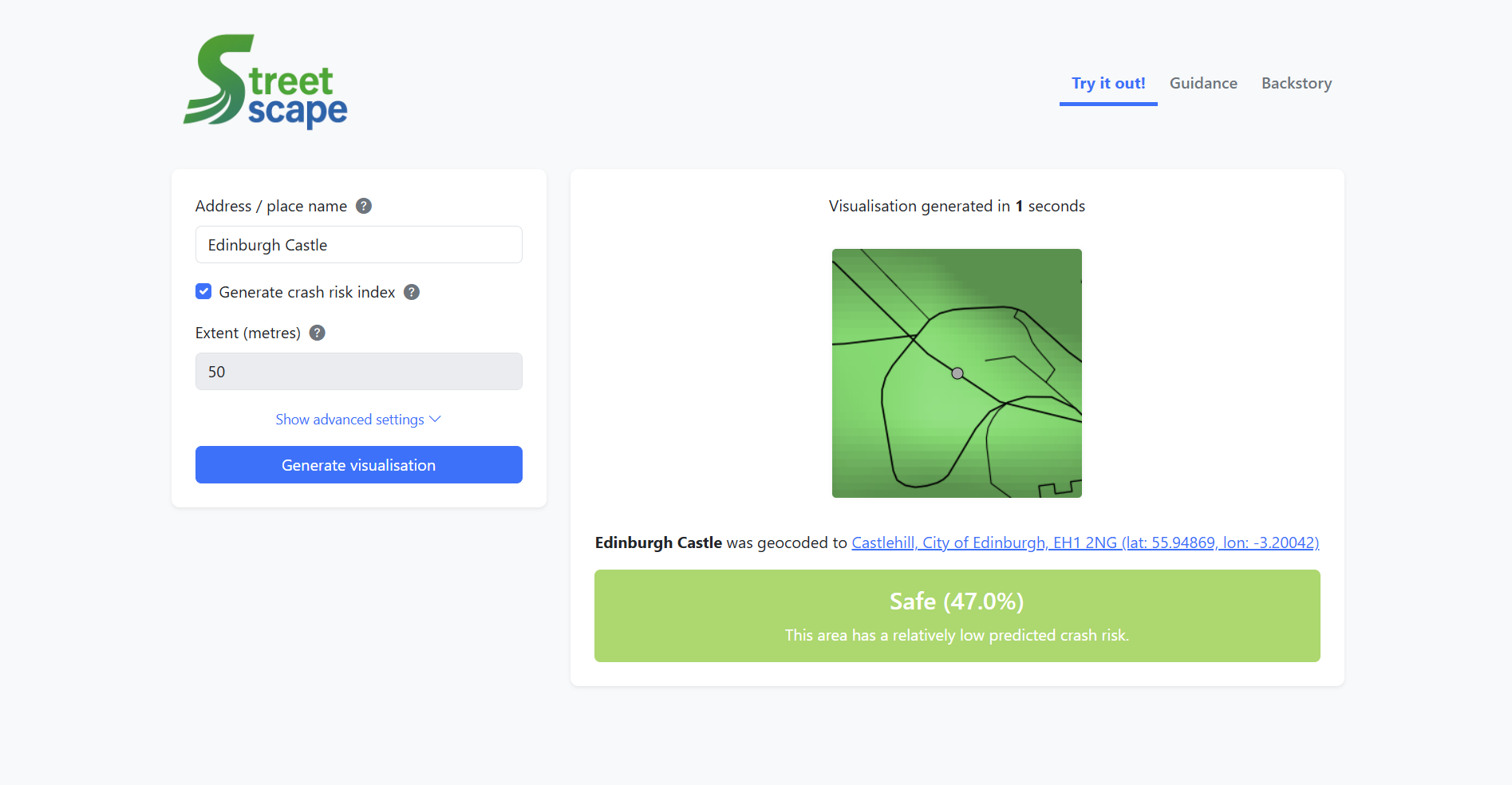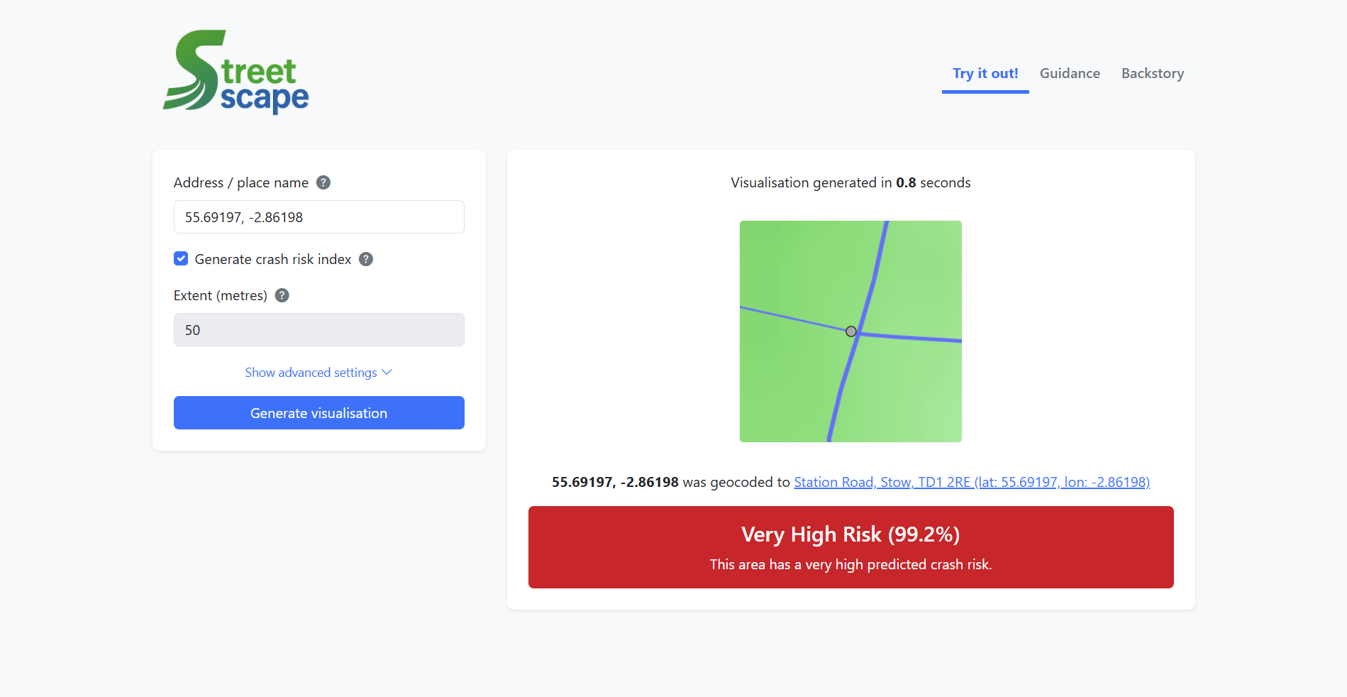 The more eagle-eyed among you might have spotted a new checkbox in the interface – Generate crash risk index. I’ve loaded the machine learning model trained on images generated by the image generation tool that powers Streetscape (read more here), into Streetscape, and now with almost no additional latency you can have it produce a crash risk index that indicates how dangerous it thinks the geography represented in your generated image is. It does sadly lock you to a specific set of parameter values: the parameter values used to generate the images that trained the model.