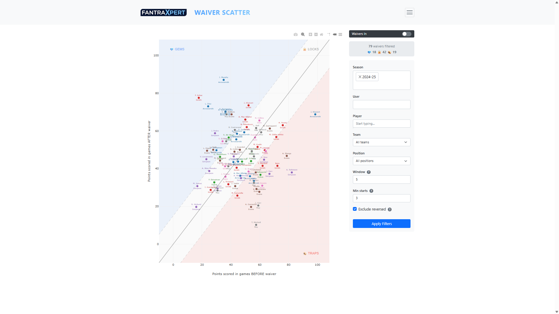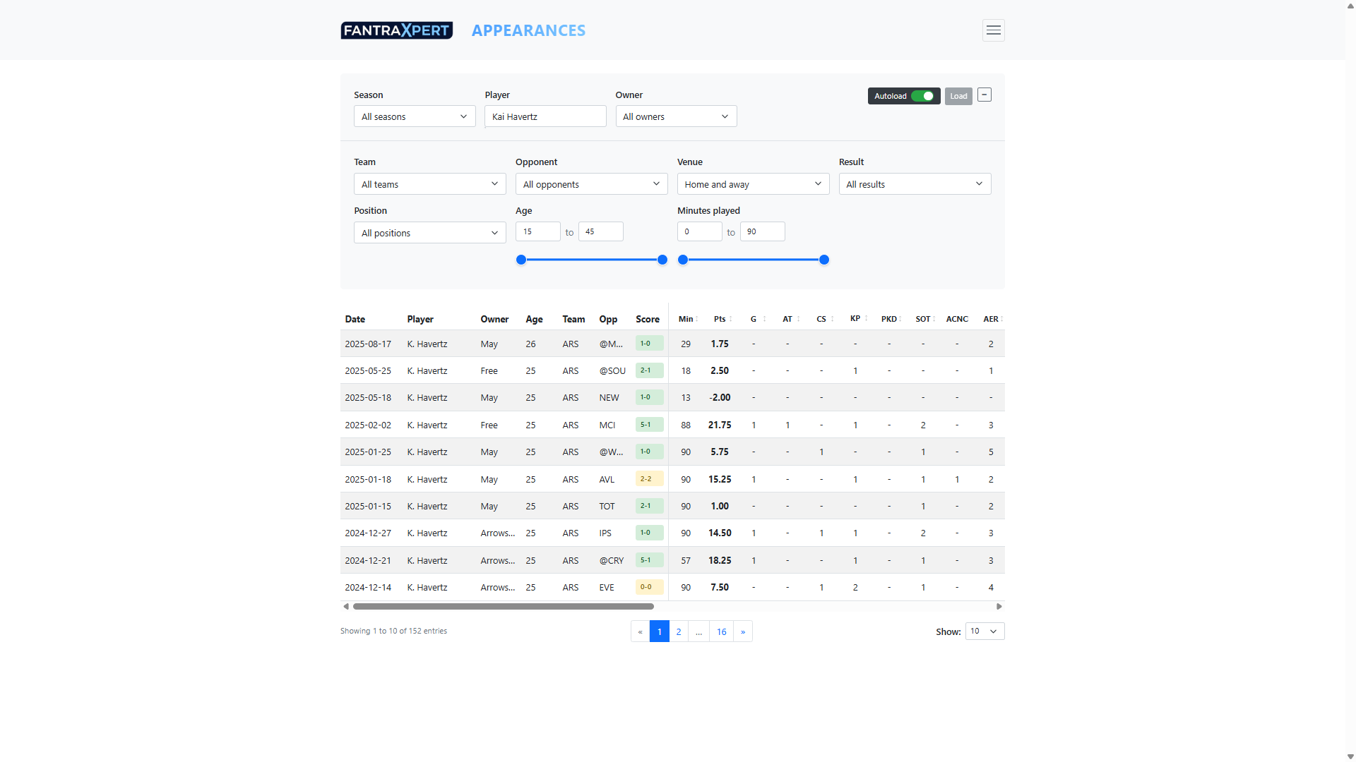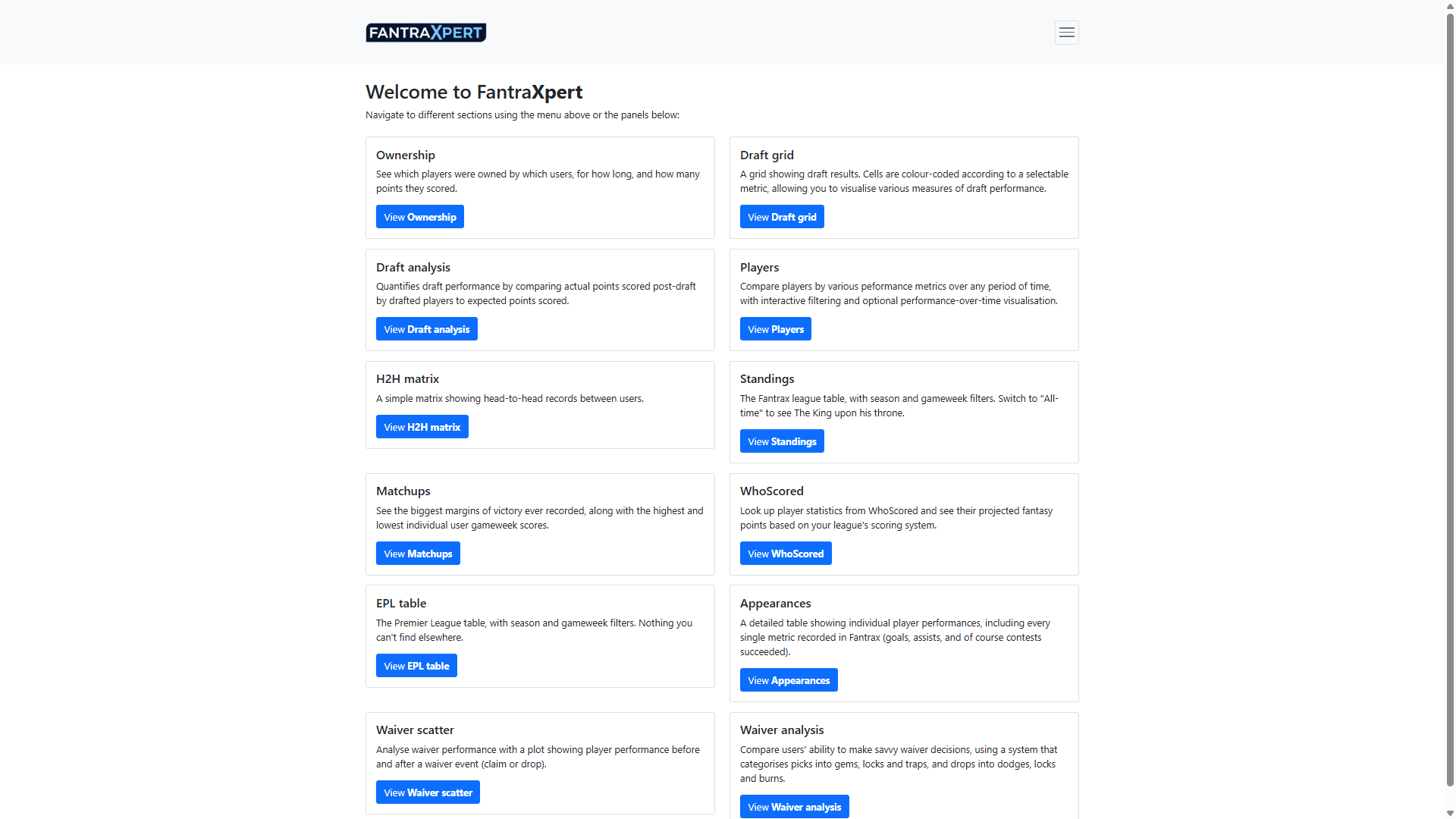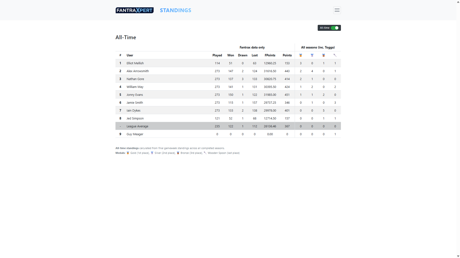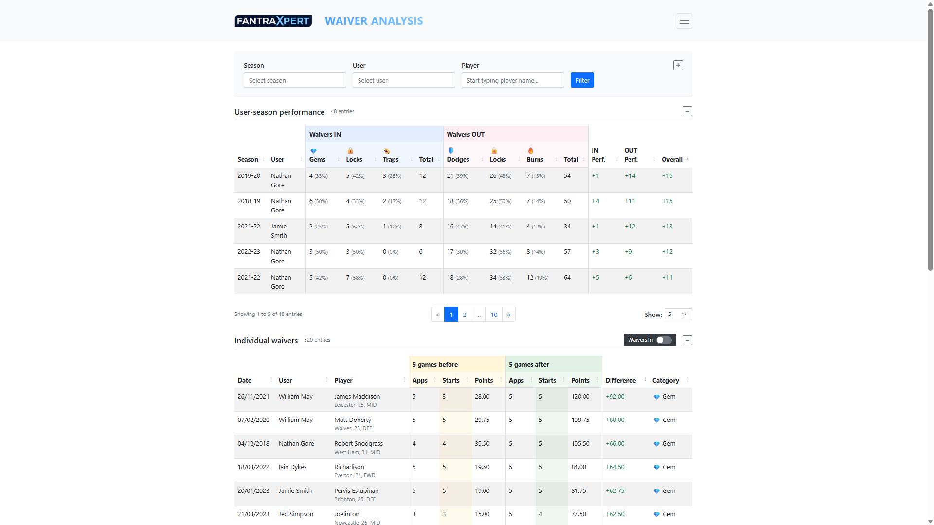 It’s called FantraXpert (name selected over FannyDash and OnlyFantrax) and it’s a data dashboard, comprising a number of different views onto data harvested from our Fantrax league. These views can be filtered by a variety of dimensions, and include bespoke visualisations and sortable, paginated tables. Below are screenshots taken from the app: