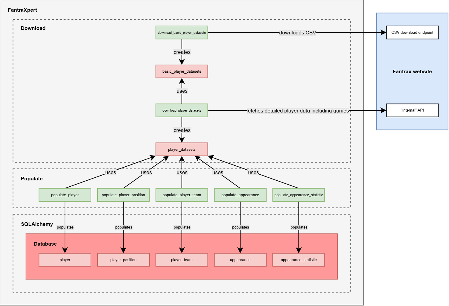 - Reference data is hard-coded – think seasons, users, drafts. You probably could get this stuff off the website, but because the data is fundamental and low-volume, it’s much simpler to simply hard-code it, which is done in a single Python module
