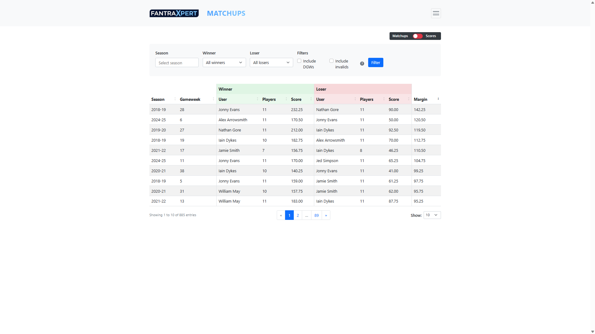 - Optimal bench play toggle – this would be a counterfactual filter on the “Matchups” and “Standings” pages for showing how results and even entire seasons might have panned out differently given optimal “bench play”, i.e., if on any given gameweek a user had started the 11 players in their squad who did the best that gameweek (in a valid formation)